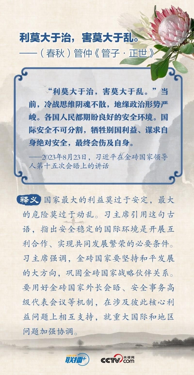 “順理而舉易為力,背時而動難為功”“變化者,乃天地之自然”“利莫大于治,害莫大于亂”…… 2023年的“金磚時間”里,習近平主席多次在講話中引經(jīng)據(jù)典,闡述金磚國家的合作與發(fā)展之道。央視網(wǎng)《聯(lián)播+》特擷取習主席用典金句,與您一起學習。