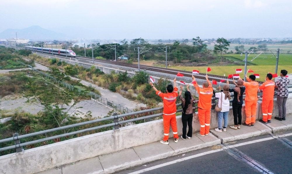 △2023年10月17日,在印度尼西亞萬隆一座天橋上,雅萬高鐵中國建設(shè)者和印尼籍員工揮舞著中國和印尼兩國國旗,向遠處駛來的一列雅萬高鐵高速動車組列車歡呼。