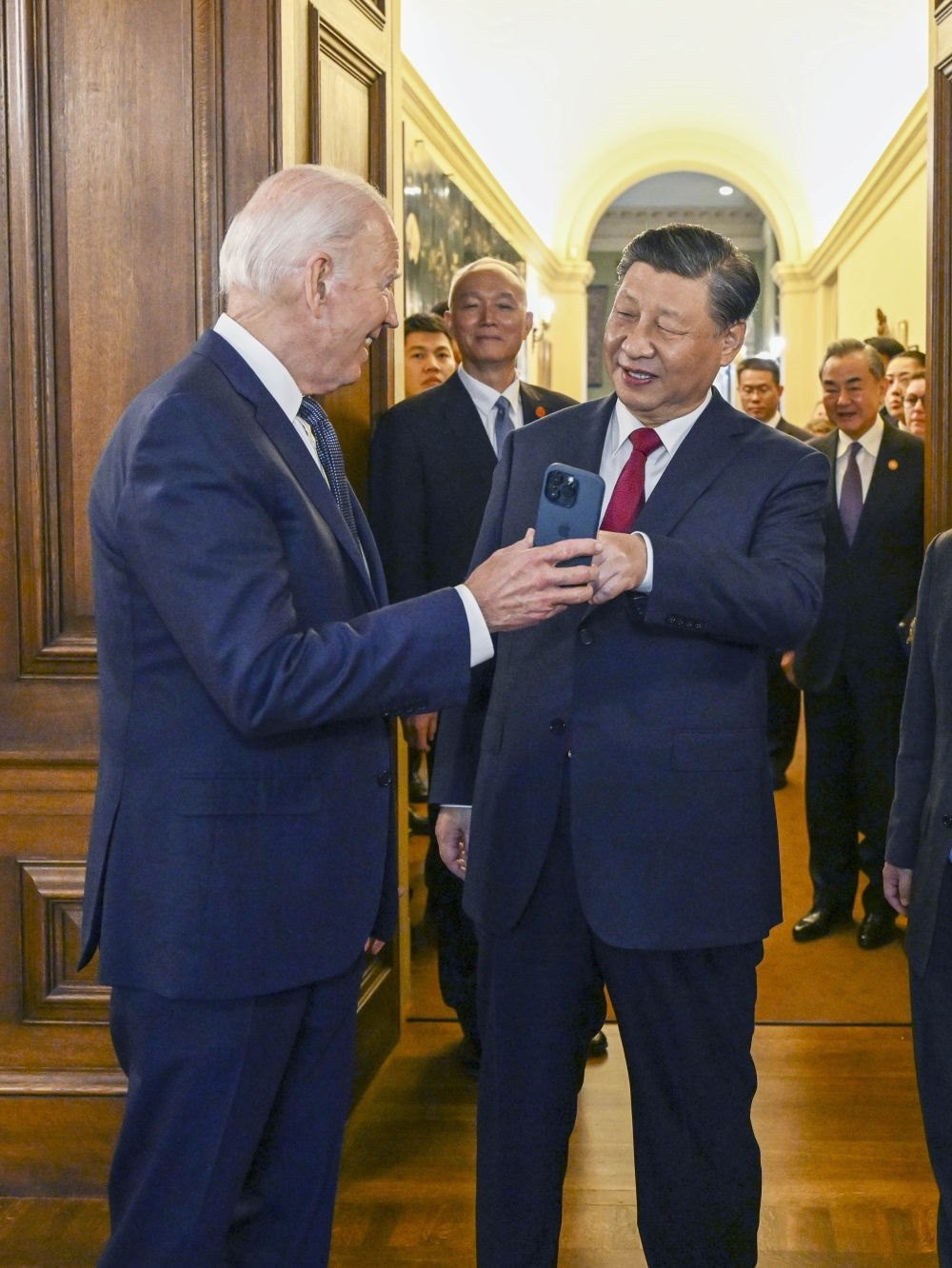 當(dāng)?shù)貢r(shí)間11月15日中午,美國舊金山郊外的斐洛里莊園,習(xí)近平主席結(jié)束同美國總統(tǒng)拜登的晤談,出席拜登總統(tǒng)舉行的宴會。這是拜登在手機(jī)上展示1985年習(xí)近平在擔(dān)任正定縣委書記時(shí)訪問舊金山的一張照片。新華社記者 李學(xué)仁 攝