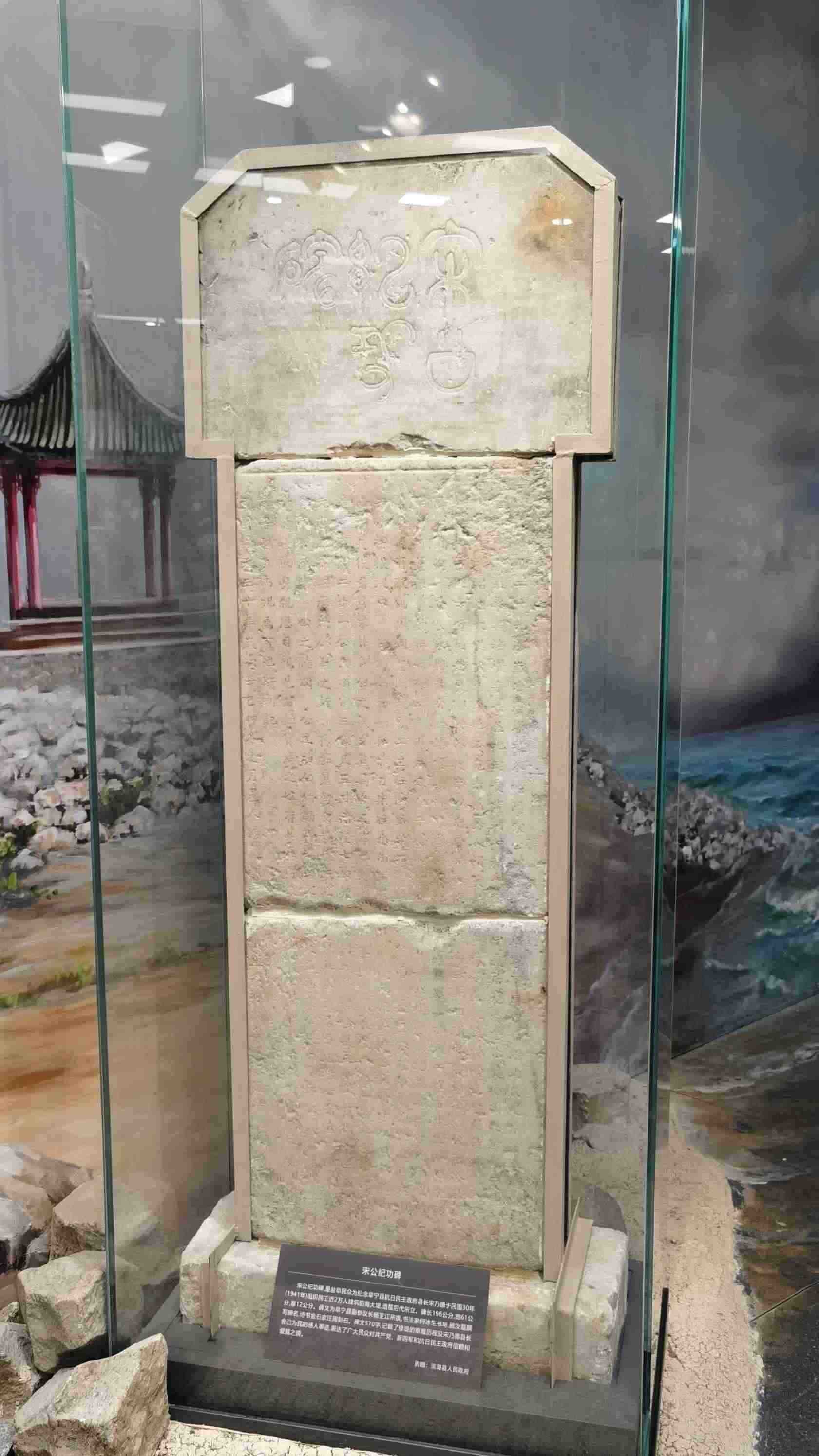 △新四軍紀念館里的宋公紀功碑。此碑是鹽阜民眾為紀念阜寧縣抗日民主政府縣長宋乃德于1941年組織修筑海防大堤所立。碑文記載了修筑大堤的艱難歷程,表達了鹽阜民眾對共產(chǎn)黨、新四軍和抗日民主政府的信賴和愛戴之情。(總臺央視記者郭鴻拍攝)