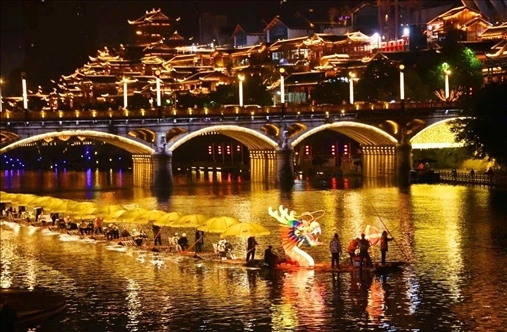 同樣迎來2024年龍年新春燈會的,還有湖北省恩施州宣恩縣城,這里的龍造型燈組格外亮眼,特別是其中一條非常壯觀的“貢水游龍”,龍身由30多只竹筏串聯(lián)而成,總長度達到200多米。游客還可以登上龍船觀燈展、賞夜色。隨著金色的巨龍在碧水中蜿蜒游動,也傳遞著吉祥的寓意。