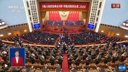 3月4日下午3時(shí),全國政協(xié)十四屆二次會(huì)議在人民大會(huì)堂開幕,全體起立,高唱中華人民共和國國歌。