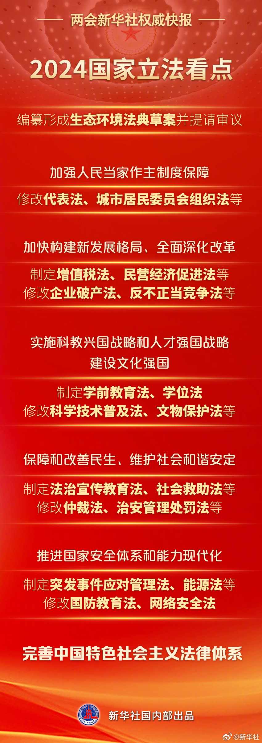8日提請十四屆全國人大二次會議審議的全國人大常委會工作報告提出,2024年,要認真落實常委會立法規(guī)劃,完善中國特色社會主義法律體系:制定民營經(jīng)濟促進法、學前教育法、社會救助法等,修改城市居民委員會組織法、文物保護法、網(wǎng)絡(luò)安全法等。