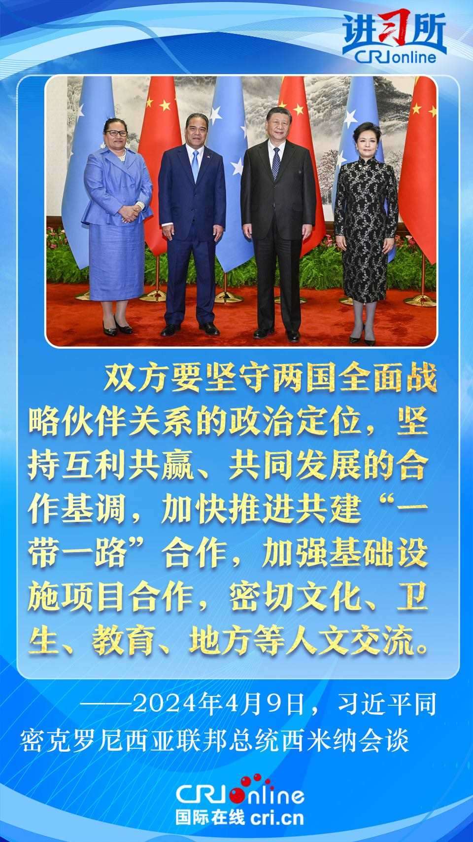 4月9日下午,中國國家主席習近平在北京同密克羅尼西亞聯(lián)邦總統(tǒng)西米納舉行會談,此訪是西米納總統(tǒng)就任以來首次訪華,兩國領(lǐng)導人就雙邊關(guān)系發(fā)展及共同關(guān)心的問題深入交換意見。