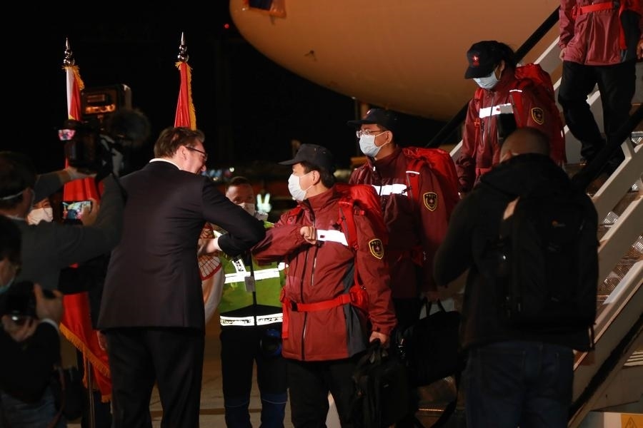 中國醫(yī)療團(tuán)隊(duì)在貝爾格萊德尼古拉·特斯拉機(jī)場降落時(shí)已是深夜。武契奇率領(lǐng)塞方多名高級官員到機(jī)場迎接。疫情期間不建議握手,于是這位塞爾維亞領(lǐng)導(dǎo)人選擇和中國專家團(tuán)成員一一碰肘以示尊重。對中國的及時(shí)支援心懷感激,他還在機(jī)場親吻了一面五星紅旗。