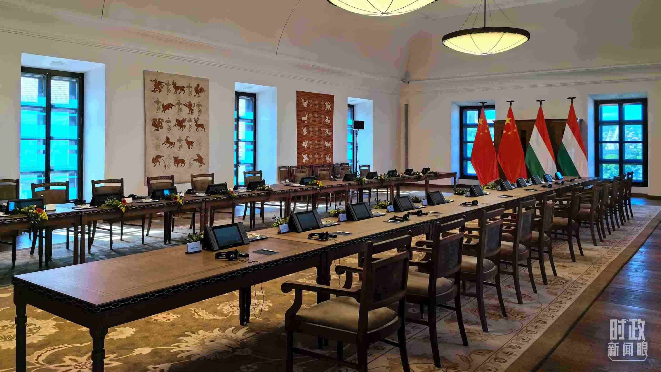 △5月9日,習主席同匈牙利總理歐爾班在這里舉行會談。這是會談開始前的現(xiàn)場。(總臺央視記者陸泓宇拍攝)