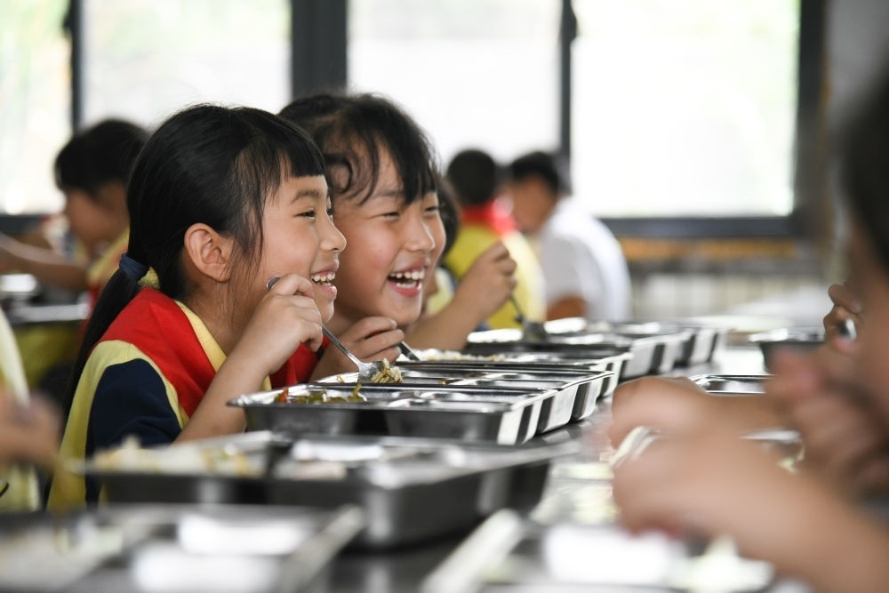 5月31日,學(xué)生在午餐時(shí)聊天。