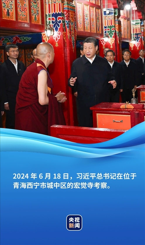 6月18日,正在青??疾斓牧?xí)近平總書記來到位于西寧市城中區(qū)的宏覺寺。在寺前院落,宏覺寺民主管理委員會負(fù)責(zé)人向總書記敬獻(xiàn)哈達(dá),僧人提香爐、持寶傘迎接總書記。