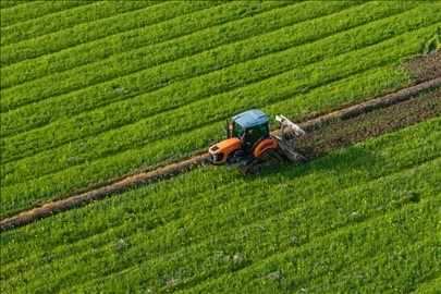2024年3月19日,在湖南省常德市鼎城區(qū)謝家鋪鎮(zhèn)港中坪村,村民駕駛農(nóng)機(jī)翻耕田地(無人機(jī)照片)。新華社記者 陳思汗 攝