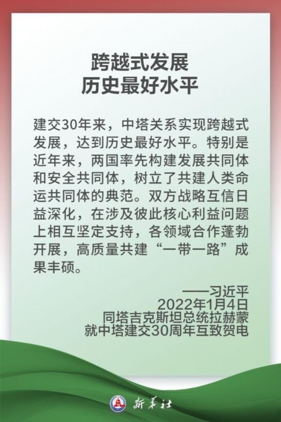 中國(guó)和塔吉克斯坦山水相連,兩國(guó)人民友好交往源遠(yuǎn)流長(zhǎng)。中塔建交30年多來(lái),兩國(guó)關(guān)系取得跨越式發(fā)展,達(dá)到全面戰(zhàn)略伙伴關(guān)系的歷史性高度。塔方最早同中方簽署共建“一帶一路”合作倡議,雙方率先建立發(fā)展共同體和安全共同體。