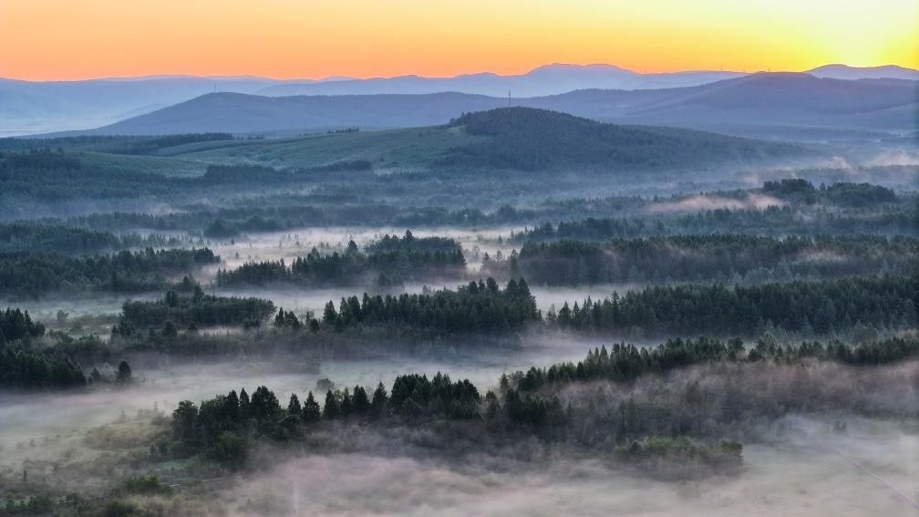 7月5日清晨,位于河北省承德市的塞罕壩國(guó)家森林公園雨后晨霧飄渺、滿目青翠(無人機(jī)照片)。