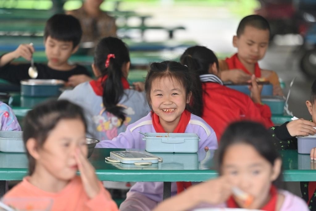 5月31日,廣西柳州市柳江區(qū)三都鎮(zhèn)覺山教學(xué)點(diǎn),學(xué)生們?cè)诔誀I(yíng)養(yǎng)午餐。