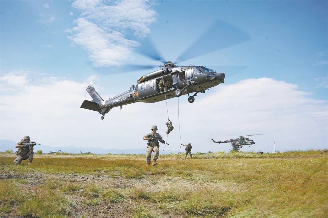 △第72集團(tuán)軍某旅某合成營(yíng)官兵在陸航部隊(duì)配合下開展機(jī)降訓(xùn)練。