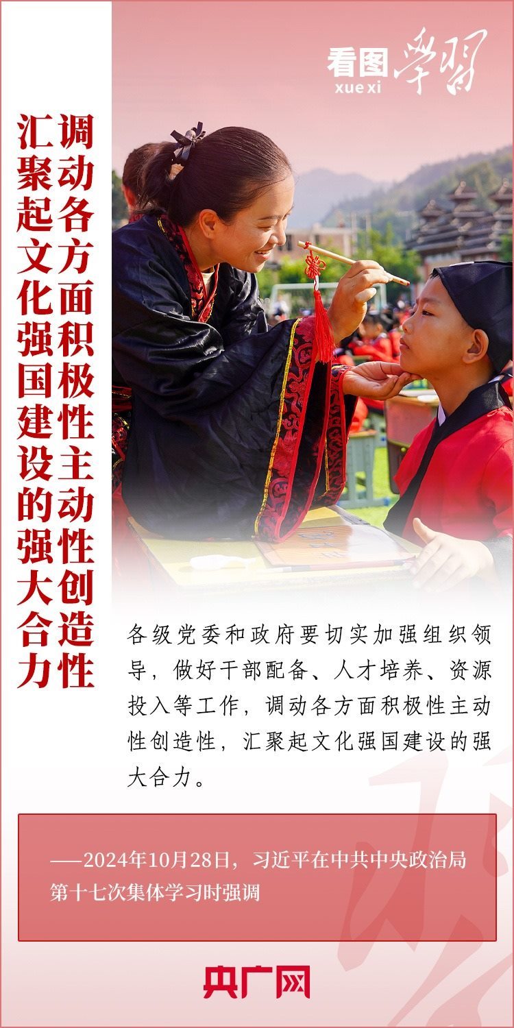 建設文化強國是全黨全社會的共同任務。10月28日,中共中央政治局就建設文化強國進行第十七次集體學習。習近平總書記在聽取講解和討論后發(fā)表重要講話,就錨定2035年建成文化強國戰(zhàn)略目標作出最新部署,強調要“不斷發(fā)展具有強大思想引領力、精神凝聚力、價值感召力、國際影響力的新時代中國特色社會主義文化,不斷增強人民精神力量,筑牢強國建設、民族復興的文化根基?!币黄饋韺W習!
