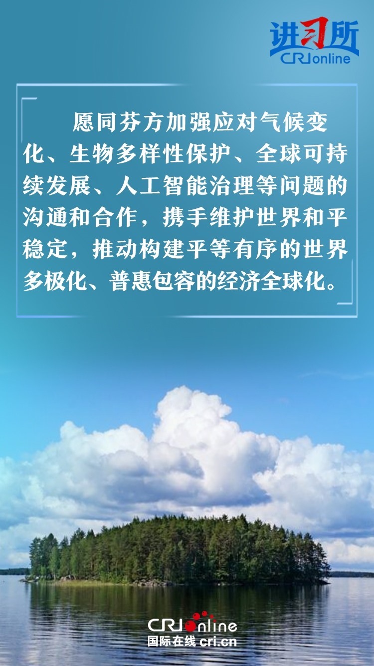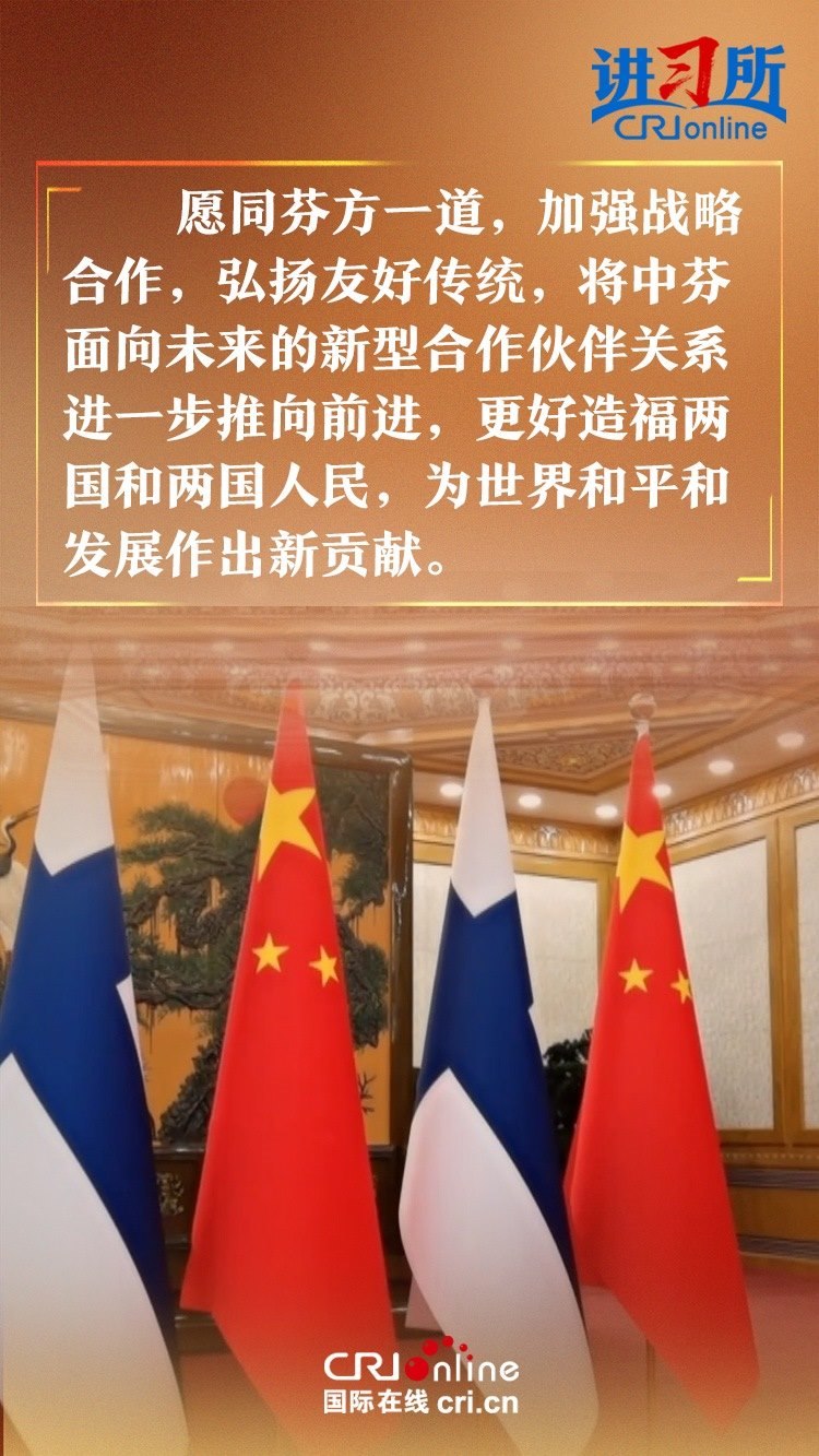 習(xí)近平指出,建交以來(lái),中芬始終友好相處、互尊互信,樹(shù)立了國(guó)與國(guó)之間超越歷史、文化、制度差異,平等交往的典范。中方愿同芬方一道,加強(qiáng)戰(zhàn)略合作,弘揚(yáng)友好傳統(tǒng),將中芬面向未來(lái)的新型合作伙伴關(guān)系進(jìn)一步推向前進(jìn),更好造福兩國(guó)和兩國(guó)人民,為世界和平和發(fā)展作出新貢獻(xiàn)。