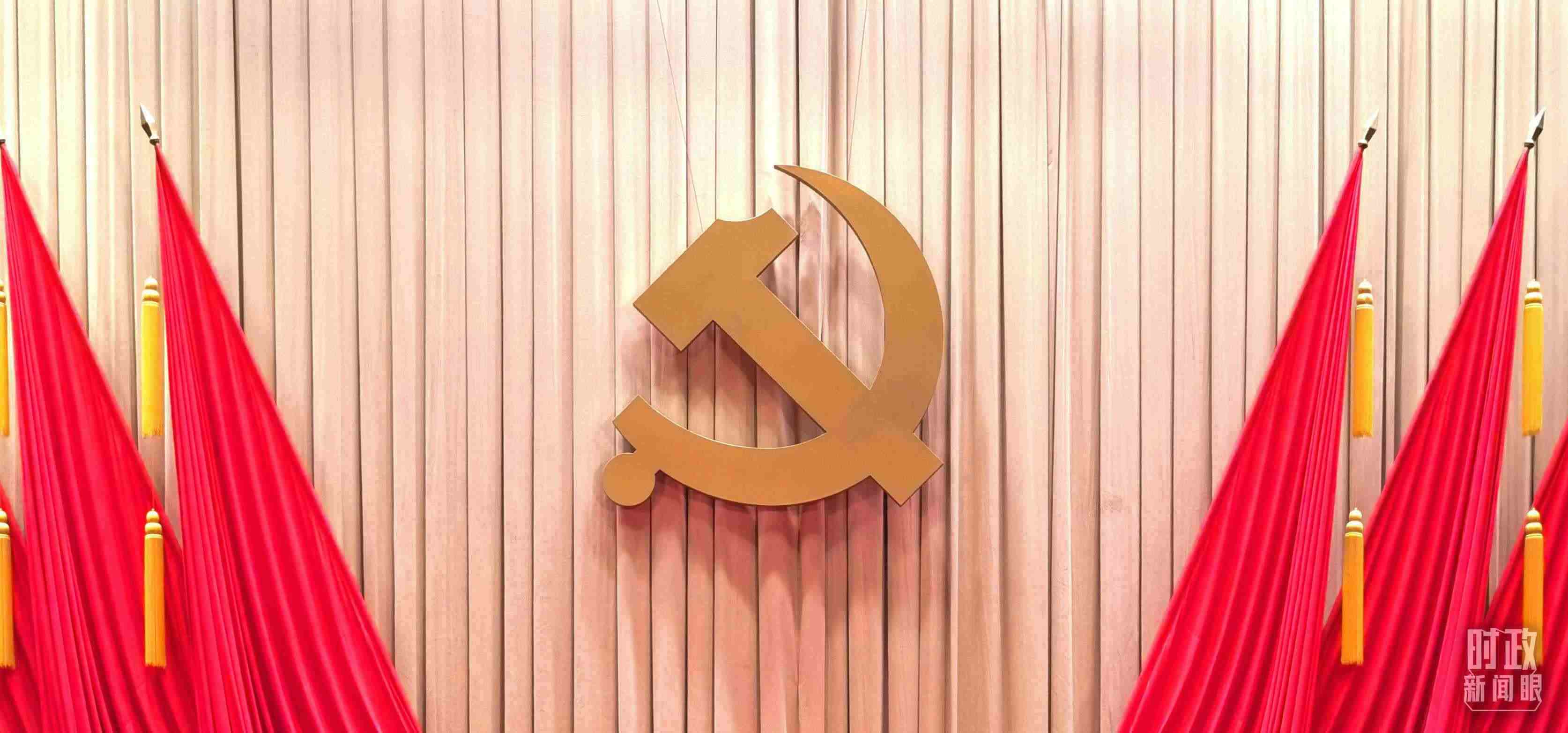 △省部級(jí)主要領(lǐng)導(dǎo)干部專題研討班開(kāi)班式現(xiàn)場(chǎng)懸掛的黨徽。(總臺(tái)央視記者郭鴻拍攝)