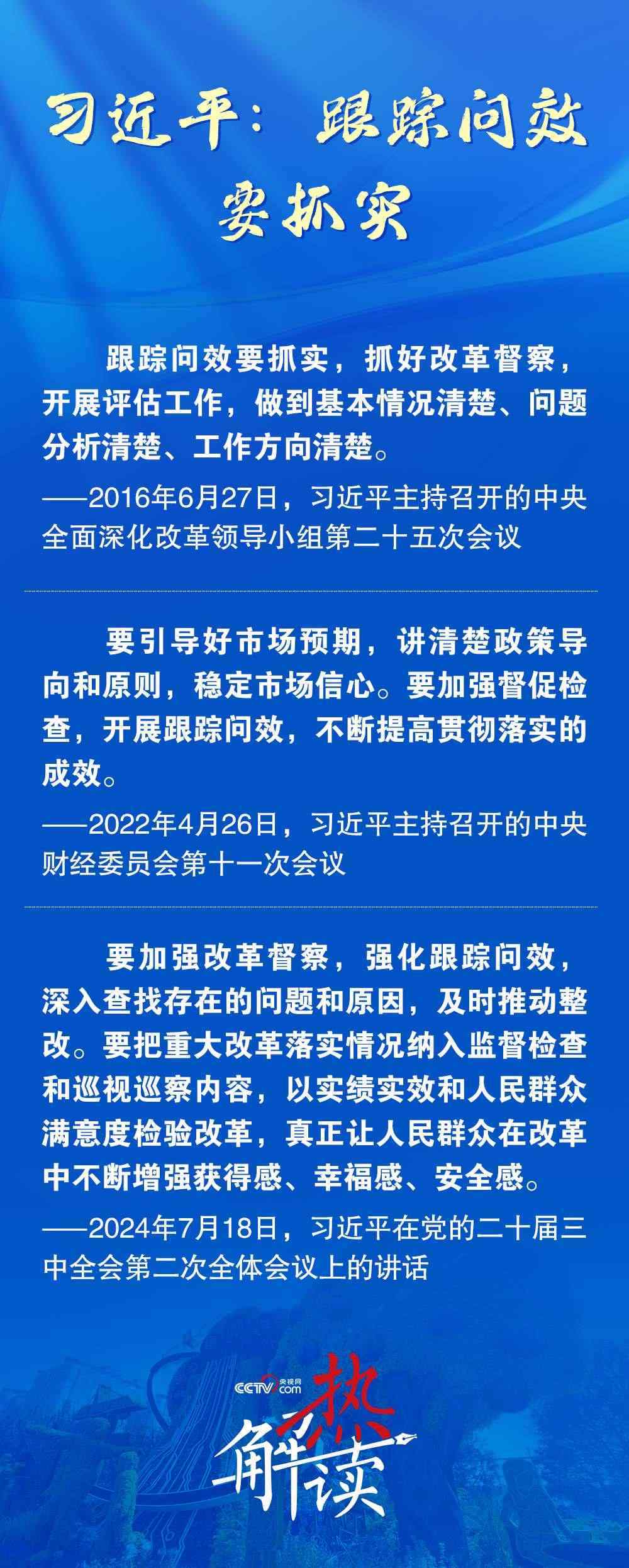 今年7月,在黨的二十屆三中全會第二次全體會議上,習(xí)近平總書記進(jìn)一步提出,要強(qiáng)化跟蹤問效,深入查找存在的問題和原因,及時推動整改。