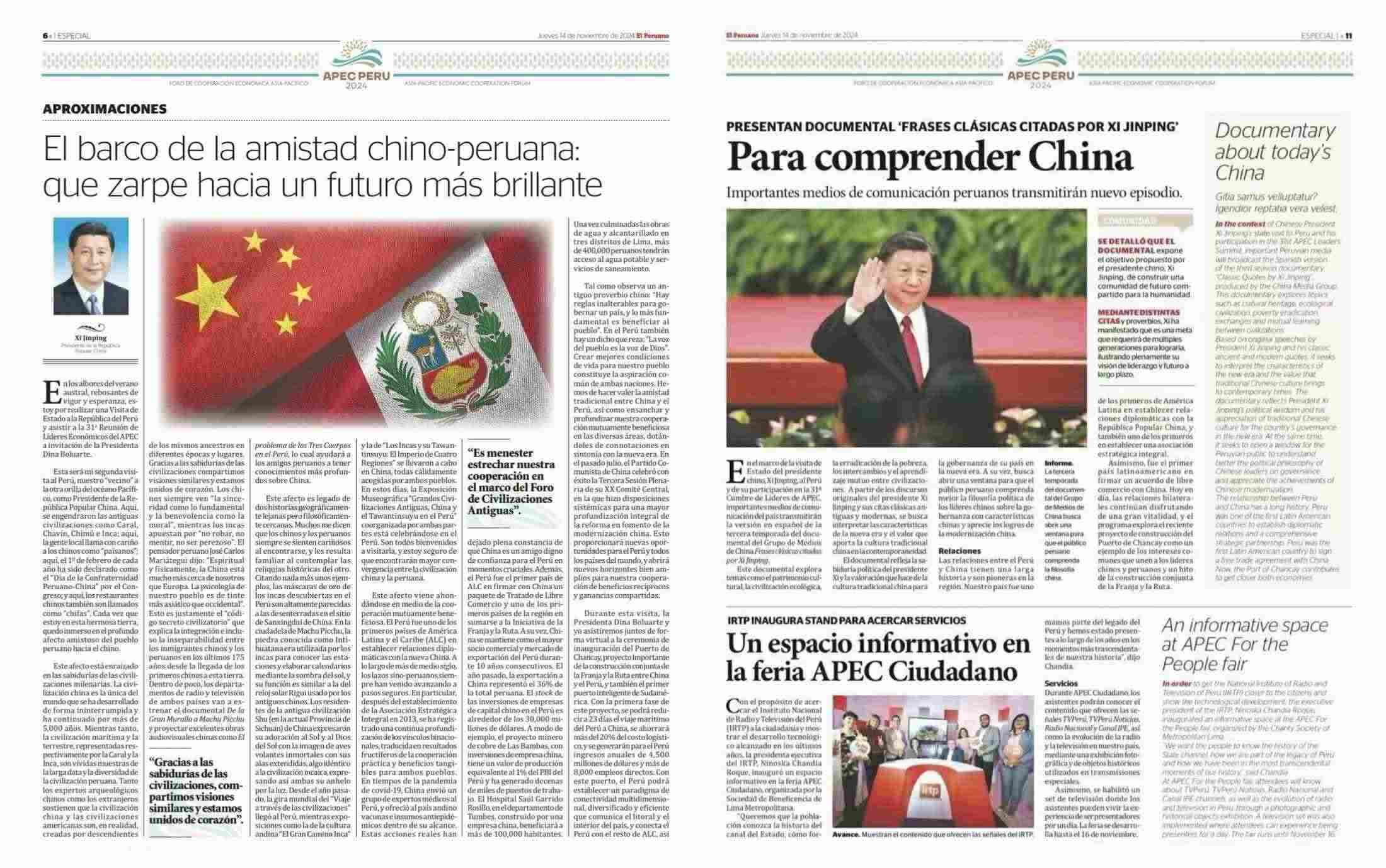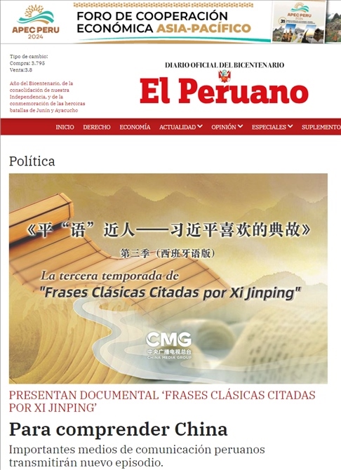 11月14日,秘魯最具影響力的官方報紙《秘魯人報》刊發(fā)節(jié)目在秘魯落播的消息。文章指出,《平“語”近人——習近平喜歡的典故》第三季展現了中華民族開放包容、兼收并蓄的文化胸懷,闡釋了習近平主席提出的推動構建人類命運共同體的這一重大理念,是對“建設一個什么樣的世界、怎樣建設這個世界”給出的中國方案。《秘魯人報》特刊整版刊發(fā)《平“語”近人——習近平喜歡的典故》第三季(西班牙語版)將在秘魯主流媒體落播特稿?!睹佤斎藞蟆饭倬W也同步刊發(fā)了節(jié)目預告消息和海報。
