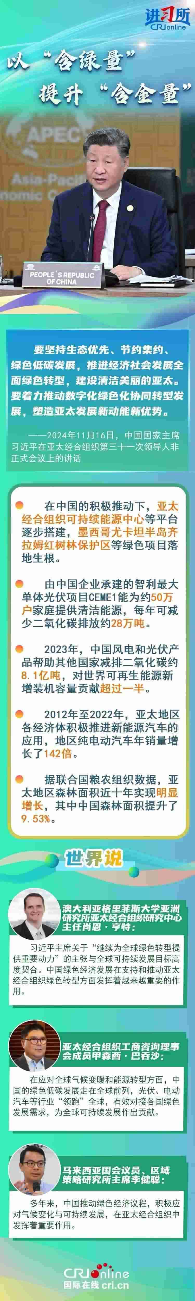 亞太之大,容得下大家共同發(fā)展。當(dāng)前單邊主義、保護(hù)主義蔓延,世界經(jīng)濟(jì)正經(jīng)受逆水行舟、不進(jìn)則退的嚴(yán)峻考驗(yàn)。習(xí)近平主席從促進(jìn)亞太合作大局出發(fā),圍繞“綠色”“創(chuàng)新”“普惠包容”等議題,闡釋中國(guó)行動(dòng),強(qiáng)調(diào)要守正創(chuàng)新,擦亮開(kāi)放亞太、包容亞太的金字招牌,打造綠色亞太、數(shù)字亞太的新招牌,推動(dòng)構(gòu)建亞太命運(yùn)共同體。