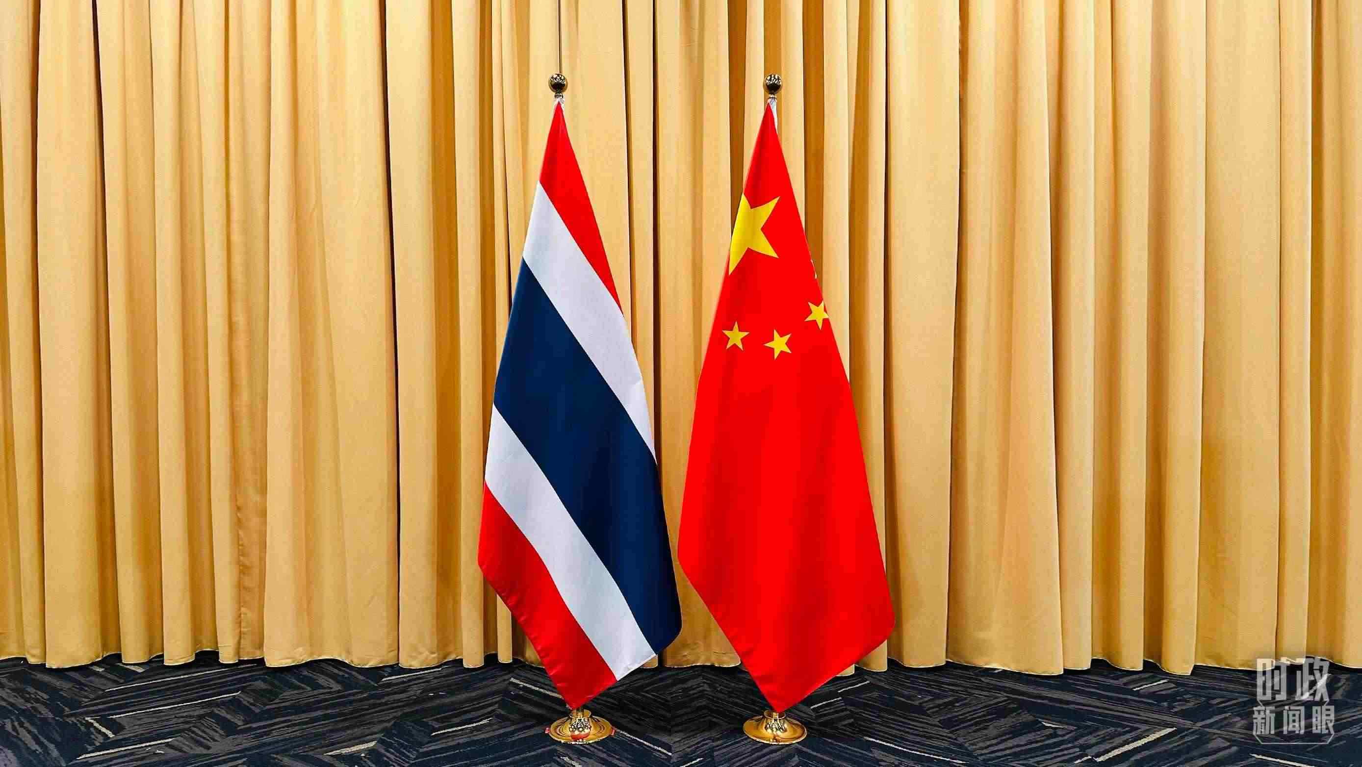 △會(huì)見現(xiàn)場的中泰兩國國旗。(總臺(tái)央視記者范一鳴拍攝)