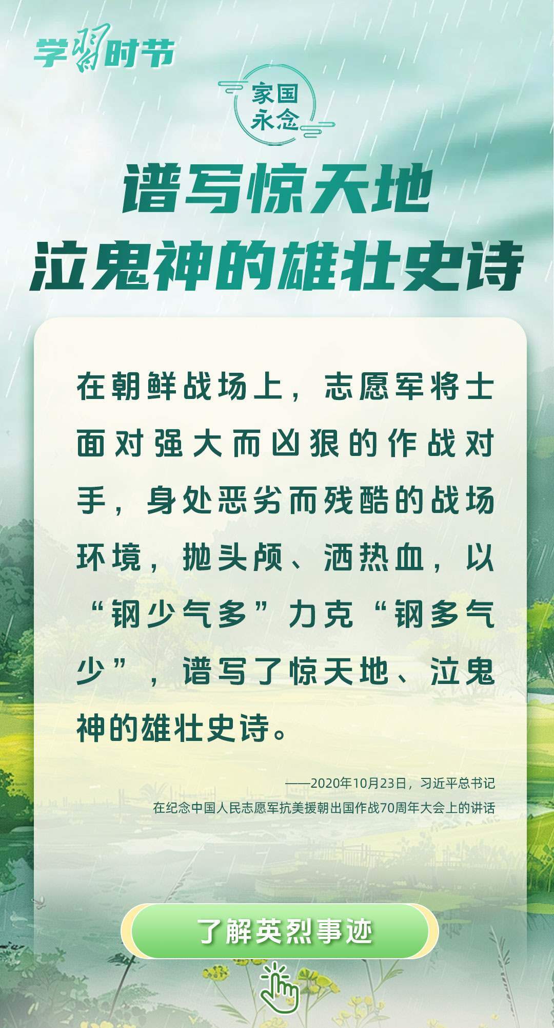 今年是中國(guó)人民抗日戰(zhàn)爭(zhēng)暨世界反法西斯戰(zhàn)爭(zhēng)勝利80周年、中國(guó)人民志愿軍抗美援朝出國(guó)作戰(zhàn)75周年。習(xí)近平總書記曾說(shuō):“對(duì)一切為國(guó)家、為民族、為和平付出寶貴生命的人們,不管時(shí)代怎樣變化,我們都要永遠(yuǎn)銘記他們的犧牲和奉獻(xiàn)。”今天我們所擁有的一切,無(wú)不凝結(jié)著英雄、英烈們的奉獻(xiàn)付出乃至巨大犧牲。