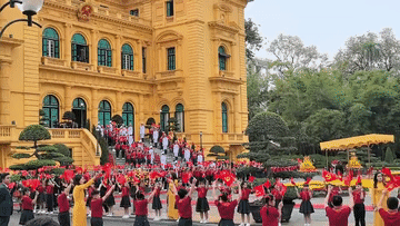 主席府廣場上,五星紅旗同金星紅旗迎風飄揚,200多名越南少年兒童揮舞旗幟,熱烈歡迎習近平到訪。