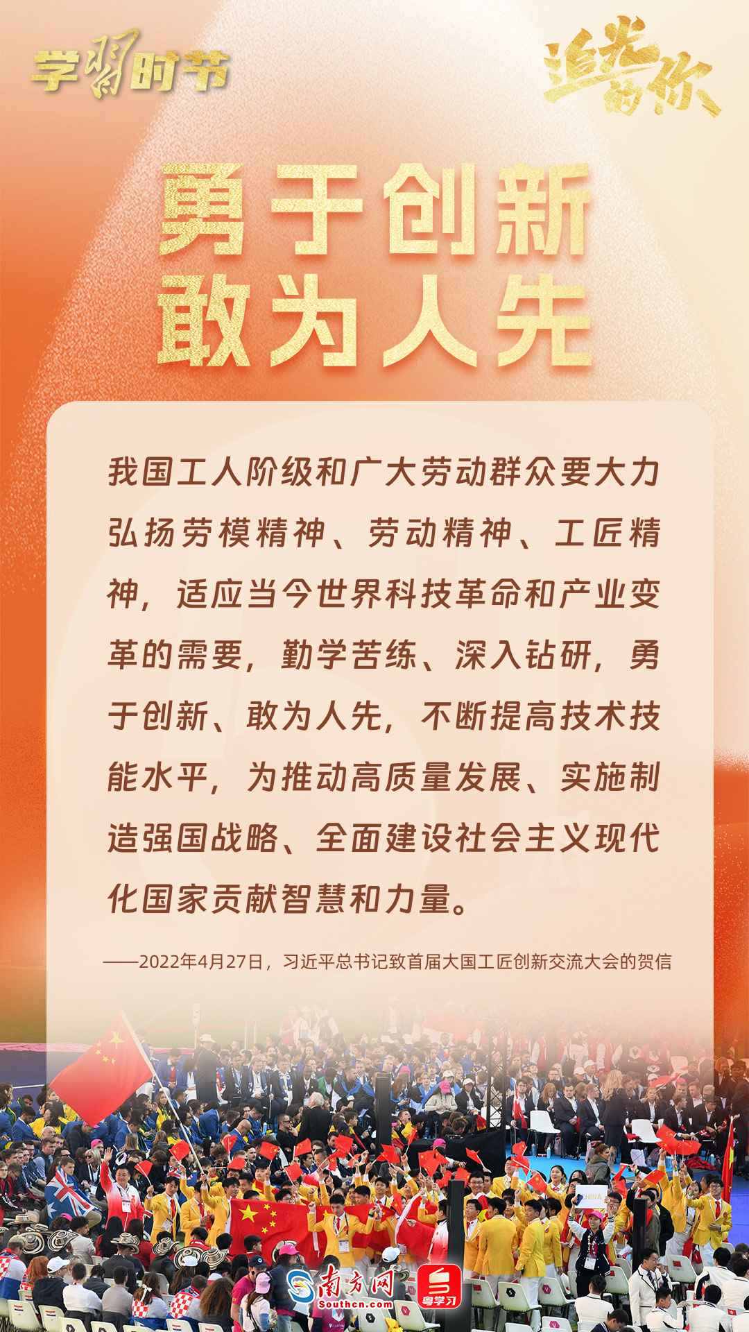 勞動譜寫時代華章,奮斗創(chuàng)造美好未來。黨的十八大以來,在以習(xí)近平同志為核心的黨中央帶領(lǐng)下,各行各業(yè)勞動者砥礪奮進(jìn),實干篤行,在全面建設(shè)社會主義現(xiàn)代化國家新征程上書寫奮斗新篇章。習(xí)近平總書記曾多次深情禮贊勞動者,勉勵廣大勞動者拼搏奮斗、爭創(chuàng)一流。