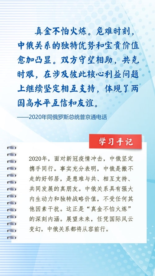 中華民族和俄羅斯民族都有悠久的歷史、古老的文明、燦爛的文化,都是偉大的民族。近年來,習近平主席常常引用中國詩詞古語、俄羅斯諺語名言等,寄語中俄關系發(fā)展和全人類和平與發(fā)展。這些重要論述,蘊含對文明、歷史的深邃思考,指引著新時代的中俄關系不斷向前,為世界百年變局中的人類文明進步事業(yè)指明方向。