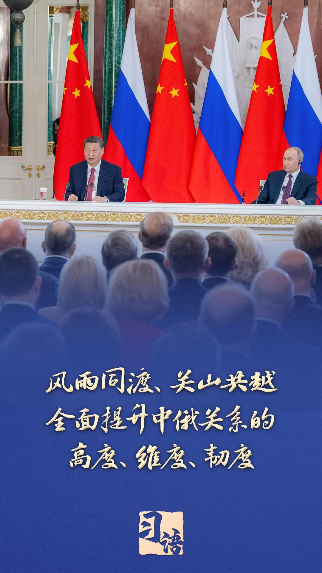 “面對變亂交織的國際形勢,中俄兩國要堅(jiān)定秉持永久睦鄰友好、全面戰(zhàn)略協(xié)作、互利合作共贏精神,風(fēng)雨同渡、關(guān)山共越,全面提升中俄關(guān)系的高度、維度、韌度,為世界和平和安全注入更多穩(wěn)定性,為全球發(fā)展繁榮提供更強(qiáng)推動力?!碑?dāng)?shù)貢r(shí)間5月8日,習(xí)近平在同俄羅斯總統(tǒng)普京共同會見記者時(shí)指出。