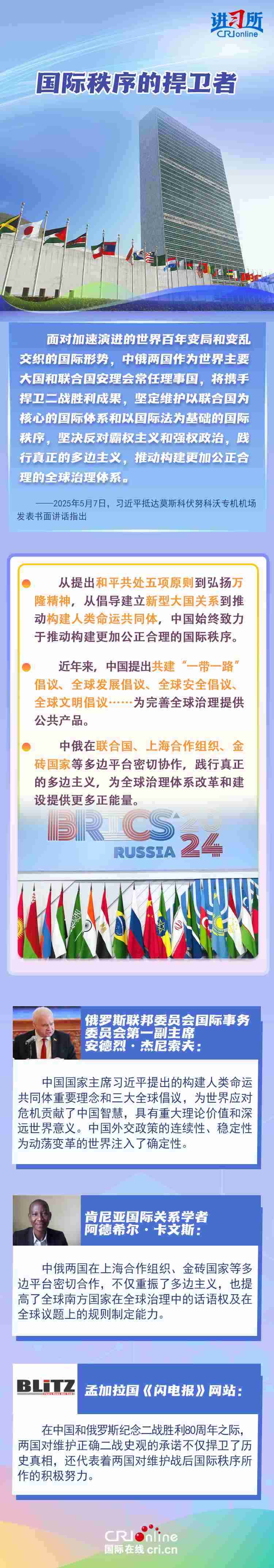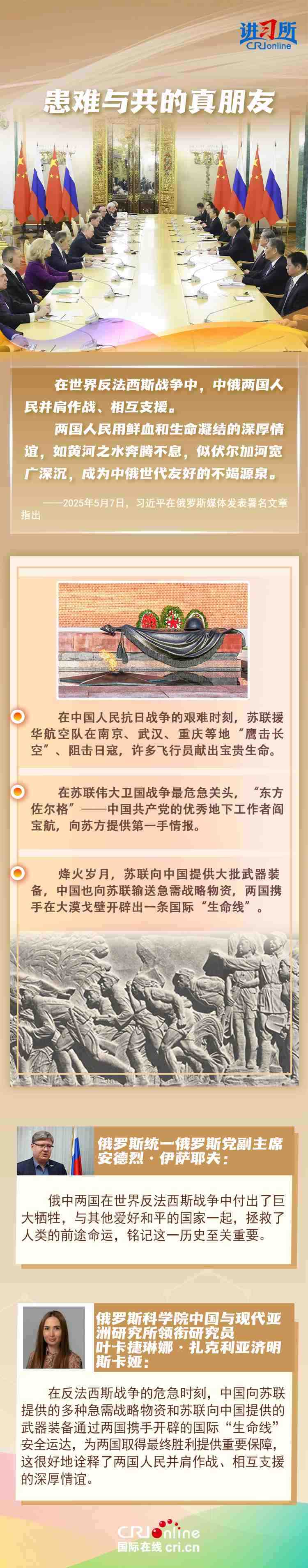 “兩國人民用鮮血和生命凝結(jié)的深厚情誼,如黃河之水奔騰不息,似伏爾加河寬廣深沉,成為中俄世代友好的不竭源泉?!苯衲晔侵袊嗣窨谷諔?zhàn)爭、蘇聯(lián)偉大衛(wèi)國戰(zhàn)爭暨世界反法西斯戰(zhàn)爭勝利80周年,也是聯(lián)合國成立80周年。在這一重要?dú)v史時(shí)間節(jié)點(diǎn),習(xí)近平主席此訪不僅為中俄關(guān)系發(fā)展注入強(qiáng)勁動(dòng)力,也向世界宣示中俄兩國攜手捍衛(wèi)二戰(zhàn)勝利成果的堅(jiān)定意志。