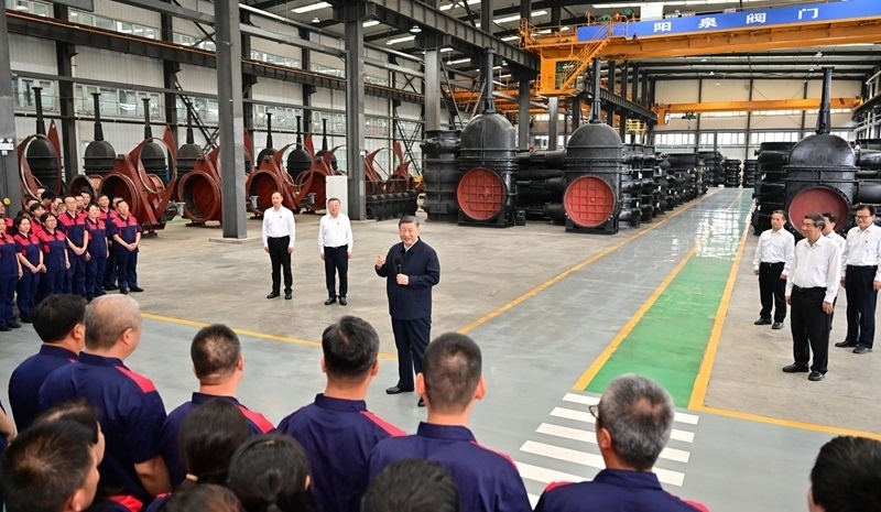 7月7日至8日,中共中央總書(shū)記、國(guó)家主席、中央軍委主席習(xí)近平在山西考察。這是7日下午,習(xí)近平在陽(yáng)泉閥門(mén)股份有限公司考察時(shí),同企業(yè)員工在一起。新華社記者 燕雁 攝