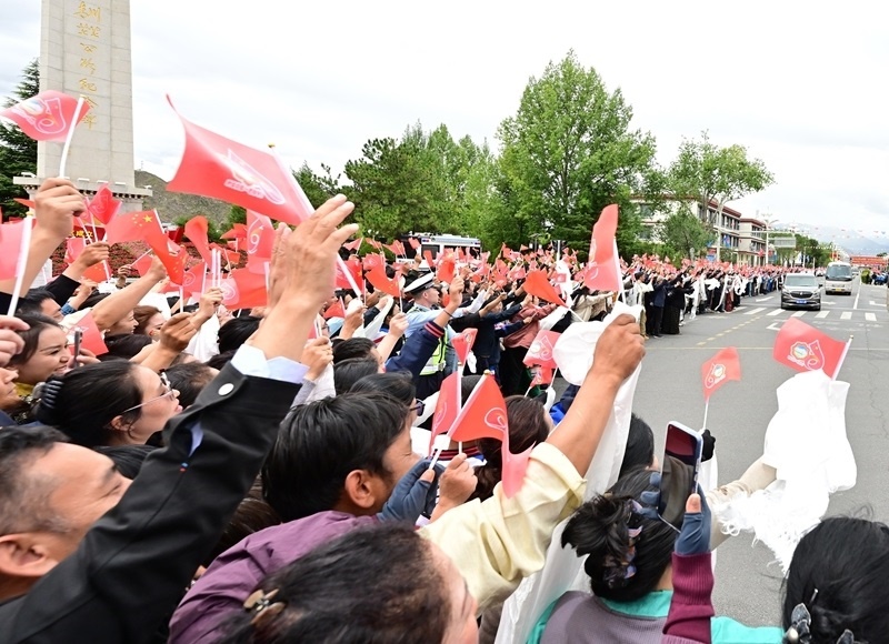 8月20日中午,中共中央總書記、國家主席、中央軍委主席習近平率中央代表團乘專機抵達拉薩,出席西藏自治區(qū)成立60周年慶?;顒印A暯降葟臋C場乘車到住地途中,各族群眾在街道兩旁熱情歡迎。