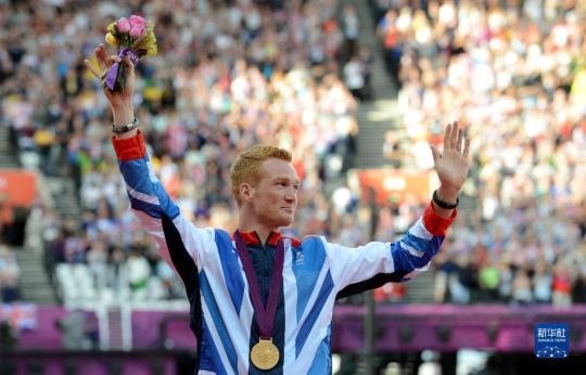 2012年8月5日,英國(guó)選手盧瑟福德在2012年倫敦奧運(yùn)會(huì)田徑男子跳遠(yuǎn)決賽頒獎(jiǎng)儀式上。新華社記者 楊磊 攝