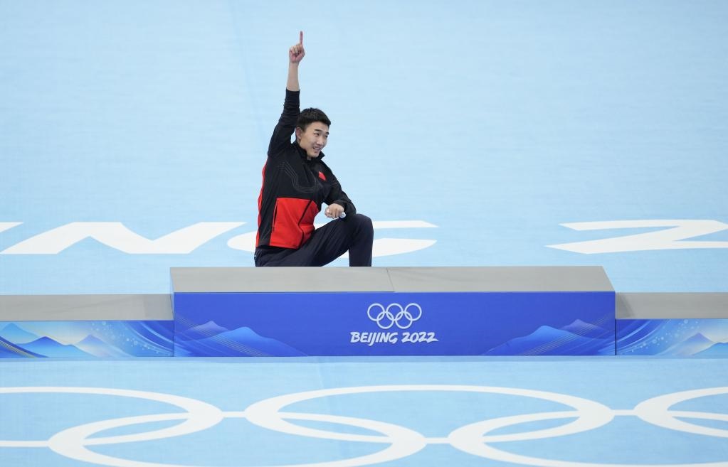 2月12日,冠軍中國選手高亭宇在獎(jiǎng)牌頒發(fā)儀式上一躍而上頒獎(jiǎng)臺。新華社記者程婷婷攝