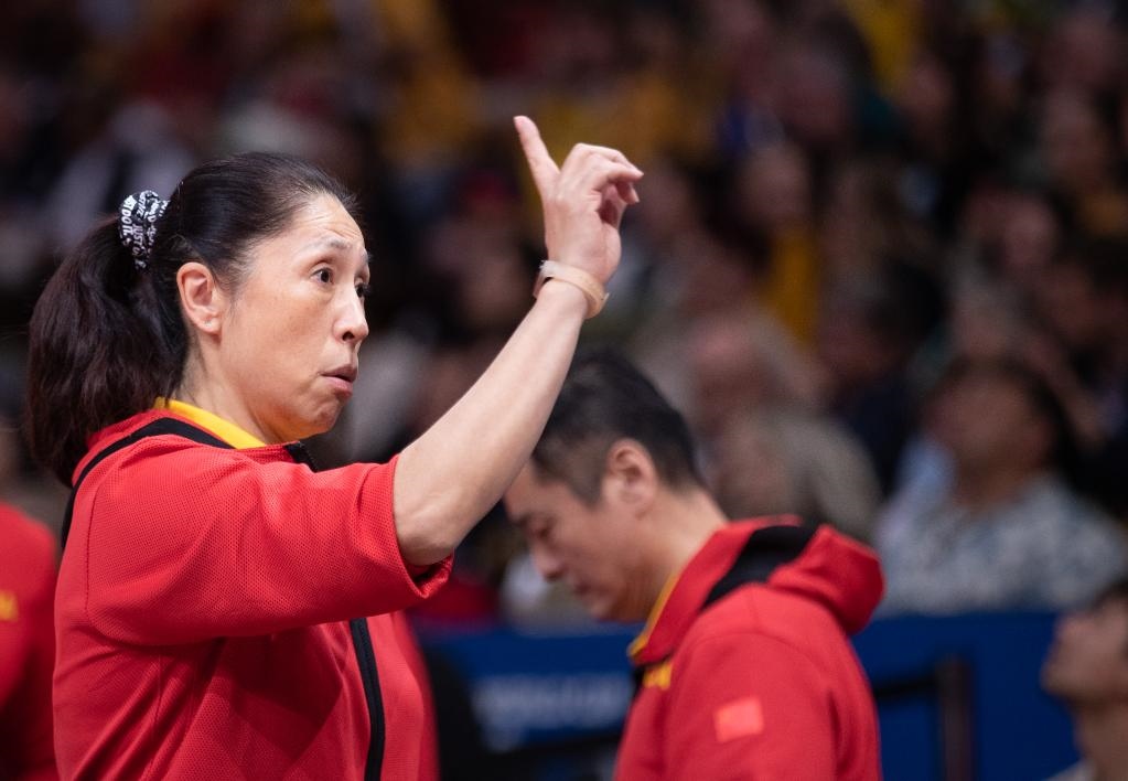 10月1日,中國隊主教練鄭薇(前)在比賽中指揮。新華社發(fā)(胡涇辰攝)
