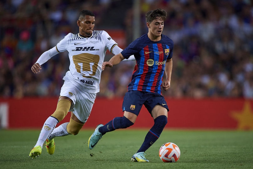 8月7日,在2022年甘伯杯足球賽中,效力于巴塞羅那隊(duì)的加維(右)與美洲獅隊(duì)球員梅里唐在比賽中拼搶。新華社發(fā)(帕布羅·莫拉諾攝)