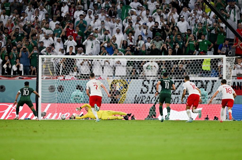 11月26日,沙特阿拉伯隊球員薩勒姆-達瓦薩里(左一)罰點球被波蘭隊守門員什琴斯尼撲出。新華社記者 辛悅衛(wèi) 攝