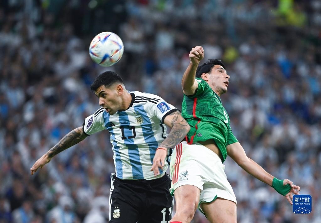 11月26日,阿根廷隊(duì)球員克·羅梅羅(左)和墨西哥隊(duì)球員勞爾·希門尼斯在比賽中爭(zhēng)頂。新華社記者 李尕 攝