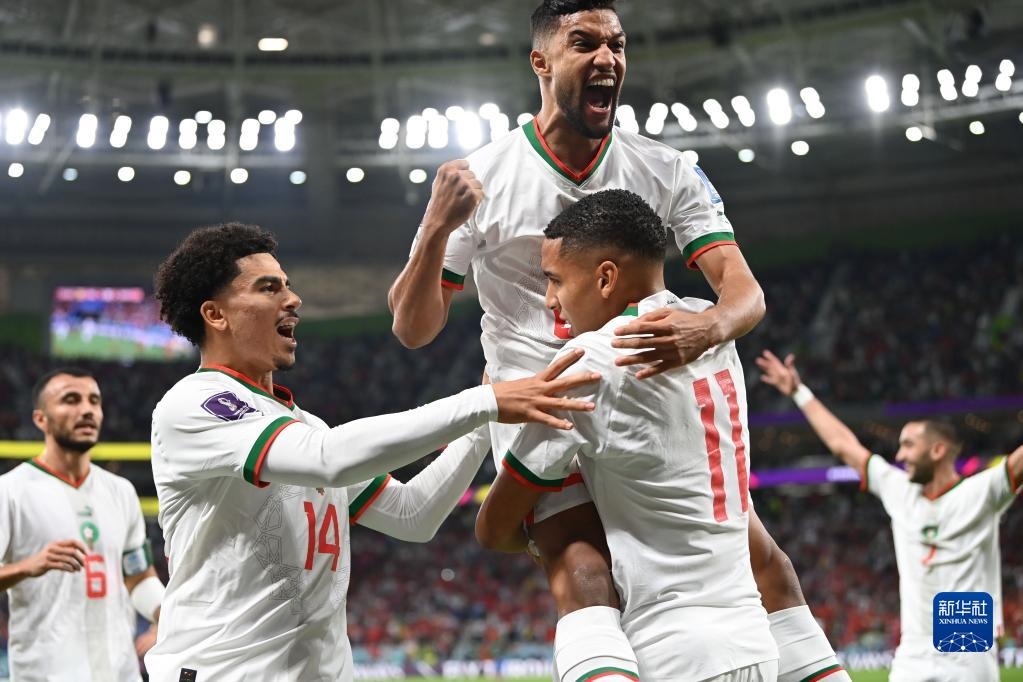 11月27日,摩洛哥隊球員阿布赫拉爾(右二,14號)打入球隊第二粒進球。新華社記者 徐子鑒 攝
