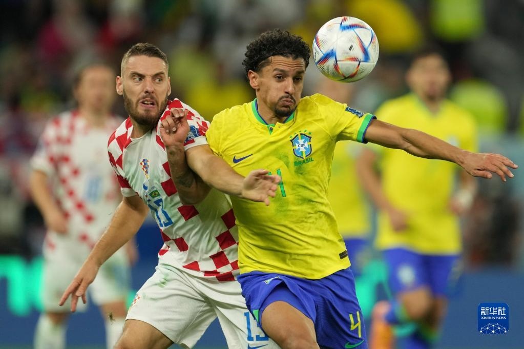 12月9日,巴西隊球員馬爾基尼奧斯(右)與克羅地亞隊球員弗拉希奇在比賽中拼搶。新華社記者 肖藝九 攝