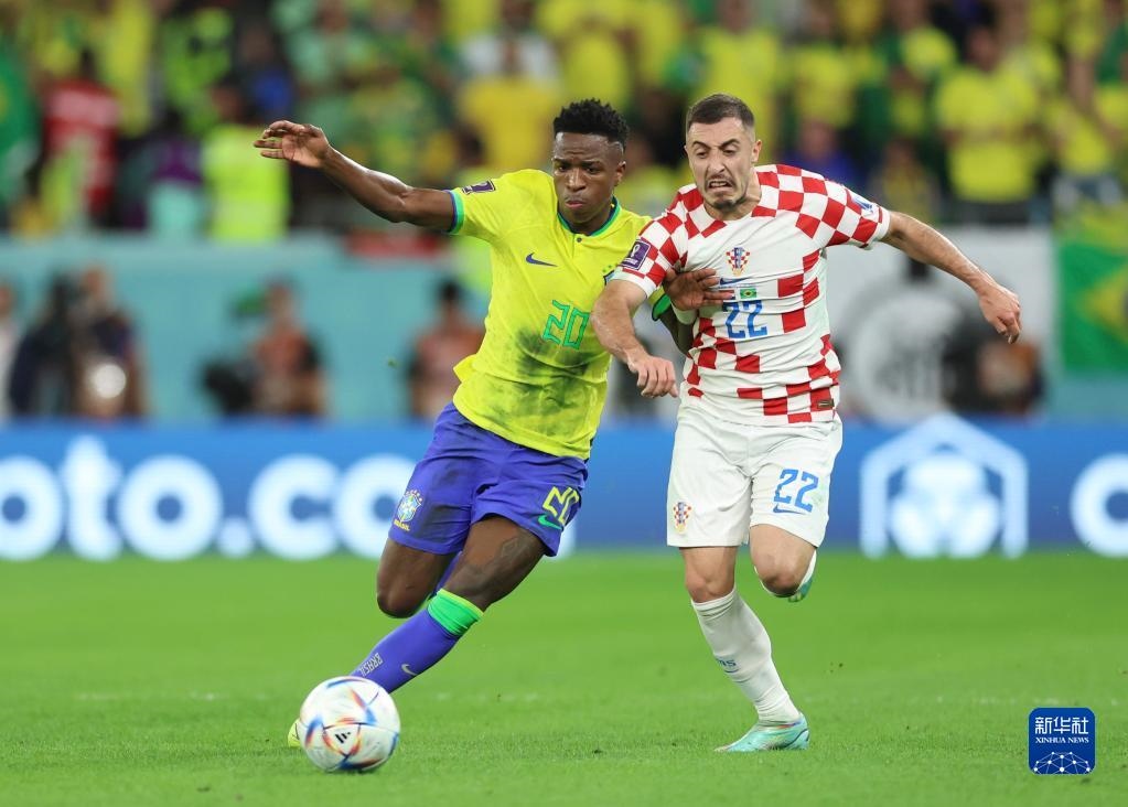 12月9日,巴西隊球員維尼修斯(左)與克羅地亞隊球員尤拉諾維奇在比賽中拼搶。新華社記者 李明 攝