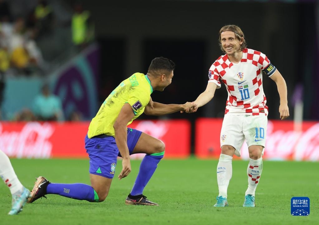 12月9日,克羅地亞隊球員莫德里奇(右)在比賽中扶起巴西隊球員卡塞米羅。新華社記者 李明 攝