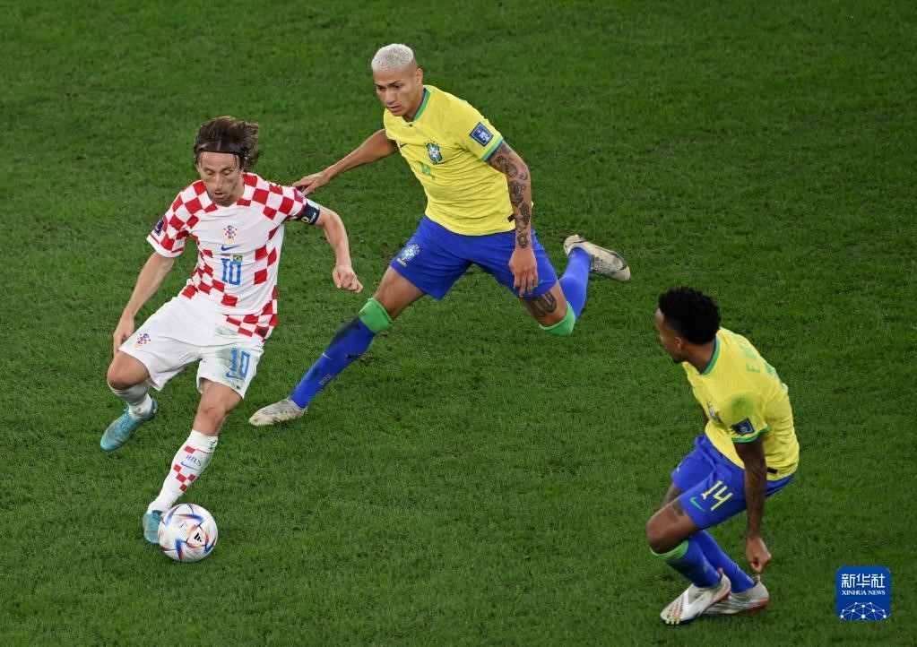 12月9日,克羅地亞隊球員莫德里奇(左)與巴西隊球員理查利森(中)、米利唐在比賽中拼搶。新華社記者 夏一方 攝