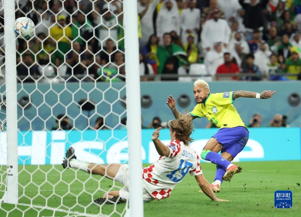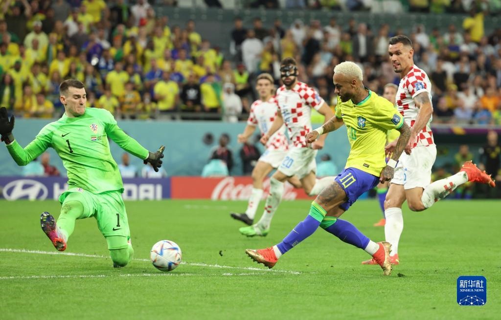 12月9日,巴西隊球員內(nèi)馬爾(右二)在比賽中突破克羅地亞隊守門員利瓦科維奇(右三)的防守后射門得分。新華社記者 蘭紅光 攝