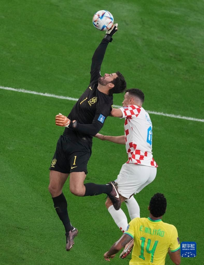 12月9日,巴西隊守門員阿利松(左)在比賽中撲救。新華社記者 孟永民 攝