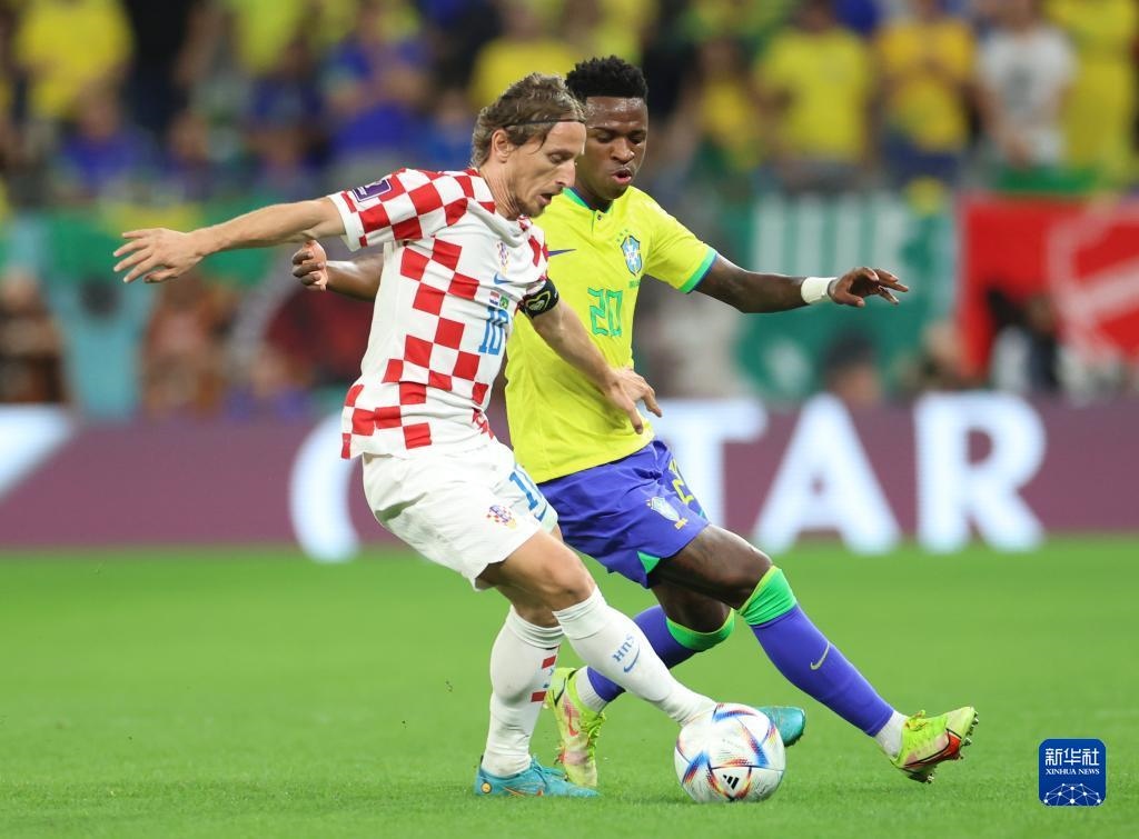 12月9日,克羅地亞隊球員莫德里奇(左)與巴西隊球員維尼修斯在比賽中拼搶。新華社記者 李明 攝