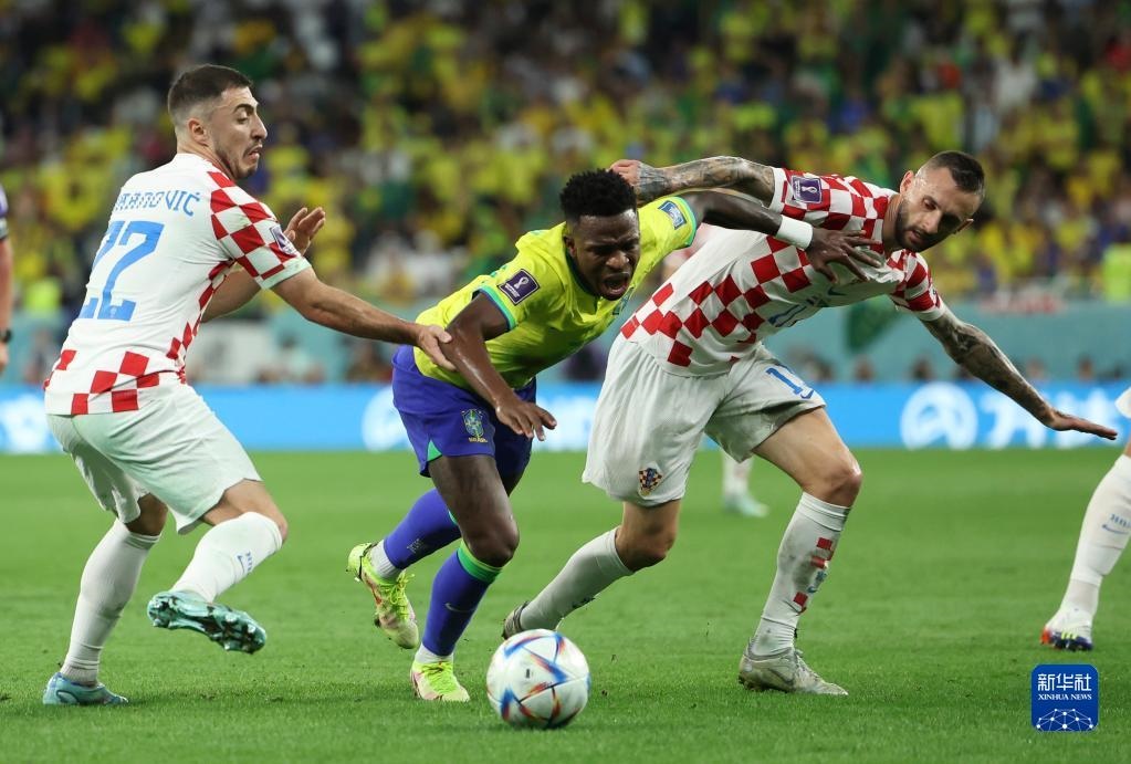 12月9日,巴西隊球員維尼修斯(中)與克羅地亞隊球員尤拉諾維奇(左)、布羅佐維奇在比賽中拼搶。新華社記者 李明 攝