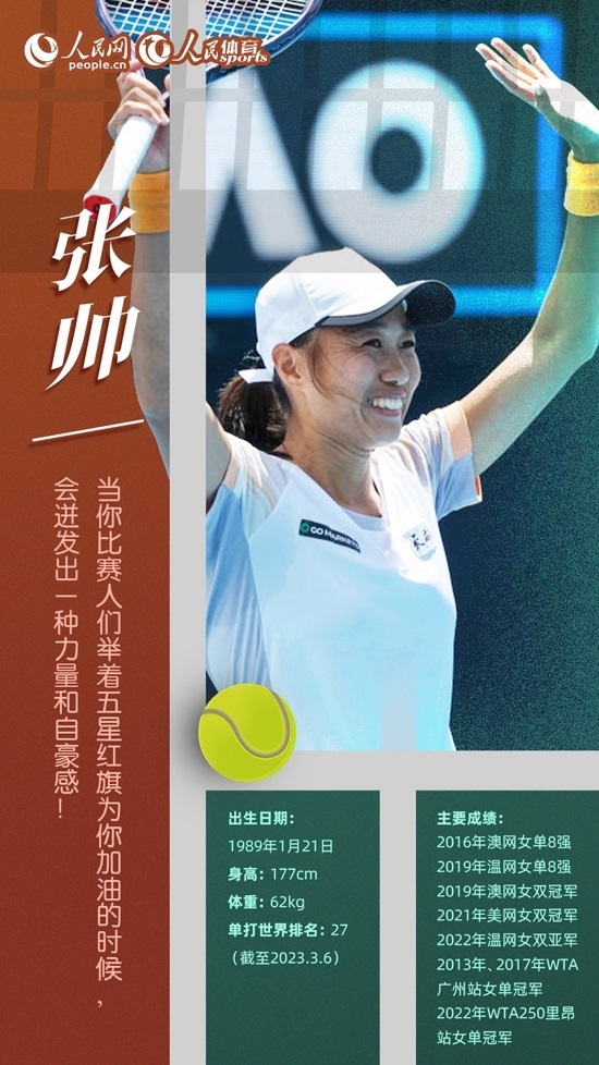 今年已經(jīng)34歲的張帥依然活躍在國際賽場上,賽季初她的單打世界排名升至第22位,創(chuàng)個人新高。澳網(wǎng)賽場,張帥單打闖進(jìn)16強(qiáng),雙打晉級第二輪。2月WTA500阿布扎站,張帥搭檔巴西球員史蒂芬妮獲得女雙冠軍,屬于老將的輝煌仍在繼續(xù)。