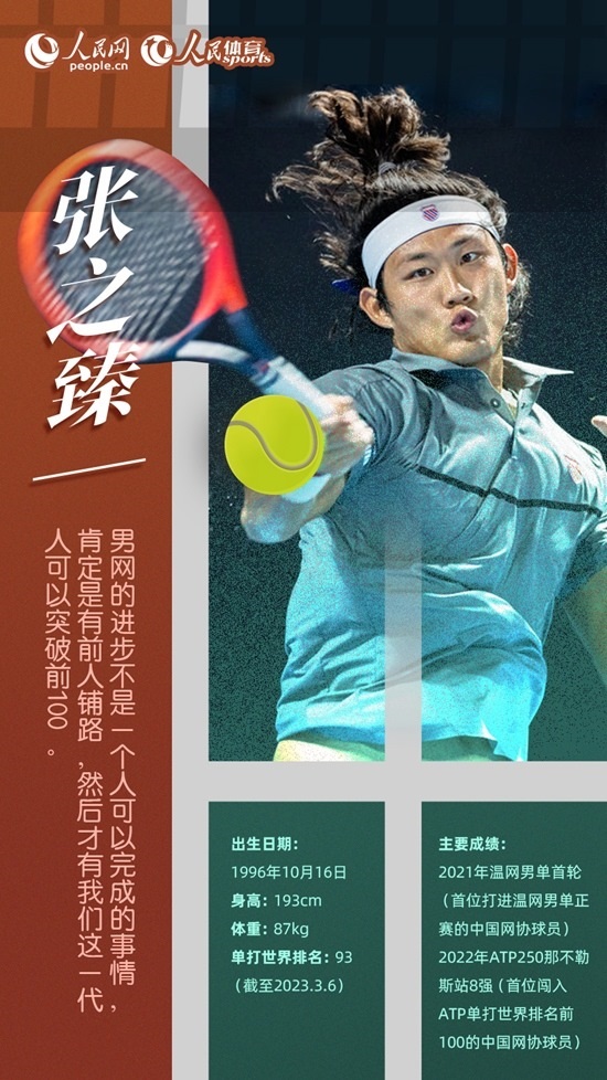 2021賽季,張之臻通過資格賽闖入溫網(wǎng)男單正賽,成為公開賽年代以來首位打進(jìn)溫網(wǎng)男單正賽的中國網(wǎng)協(xié)球員。2022年,在ATP250那不勒斯站上,從資格賽打起的張之臻最終晉級8強(qiáng),當(dāng)期世界排名升至第97位,成為首位排名世界前100名的中國網(wǎng)協(xié)男球員。