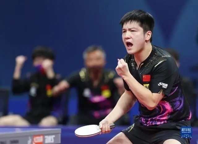 2022年10月9日,中國隊(duì)選手樊振東在比賽中慶祝得分,他以3:0戰(zhàn)勝德國隊(duì)選手貝內(nèi)迪克特·杜達(dá)。當(dāng)日,在成都世乒賽男團(tuán)決賽中,中國乒乓球男隊(duì)3:0戰(zhàn)勝德國隊(duì)。 新華社記者江宏景攝